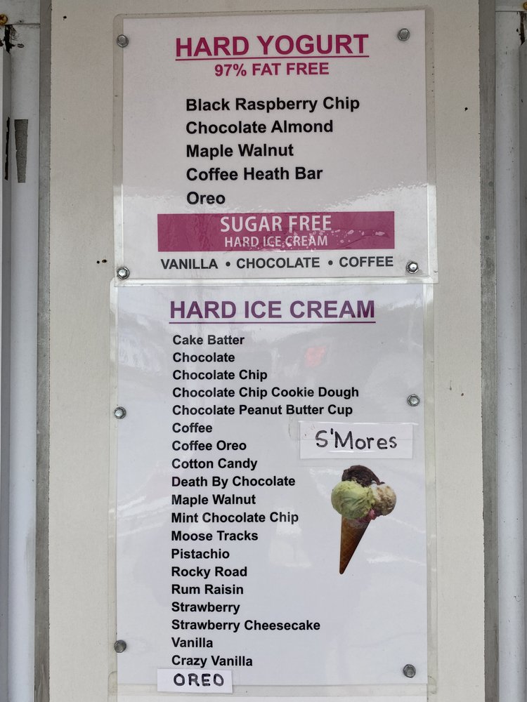 The menu features a tantalizing array of Sugar Free Hard Serve options, including Vanilla, Chocolate, and Coffee, catering to various dietary preferences. For toppings, choose from an enticing selection—imagine your ice cream adorned with crushed Oreos, Gummy Bears, or rich homemade whipped cream.